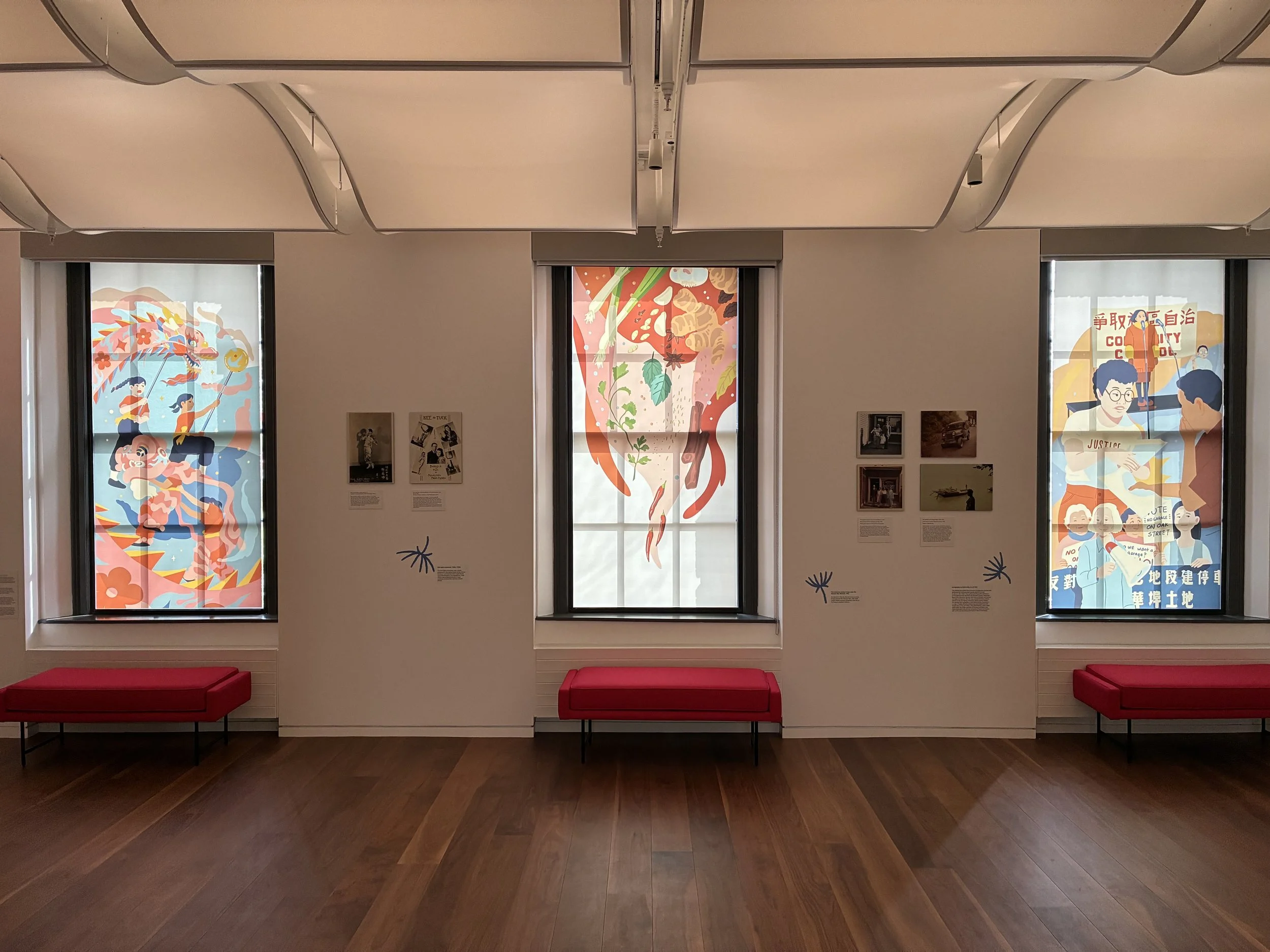 These window murals were commissioned by the Harvard Radcliffe Institute’s Schlesinger Library for their Illuminate exhibition, featuring archival materials about the lives and lived experiences of Asian American women. In that vein, I chose to illustrated three different pieces, inspired by archival material featured in the exhibit.